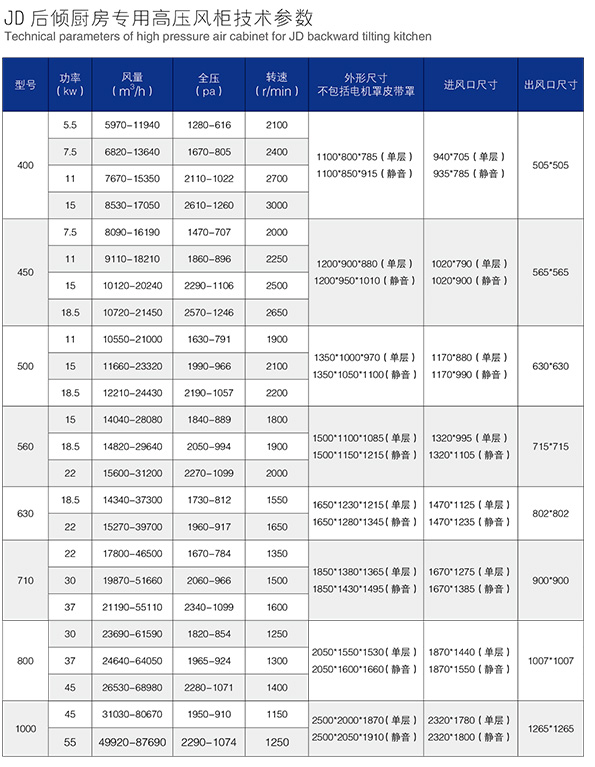 在当今建筑楼层越来越高的情况下,尤其在建筑物采用公共烟道的时候,采用传统的风柜(风机)难以满足厨房的抽排所需,造成厨房工作环境恶劣,为了进一步改善厨房的工作环境,我厂经过调研,在JD系列双进风高压风柜的基础上改进,生产专为宾馆,工厂,食堂的厨房抽排气体,而生产的JD后倾厨房专用双吸式离心风柜,该系列产品在多家五星级宾馆,酒店和高等学府的厨房安装使用,均验收合格,效果显著。该系列产品更适用于楼层高,风阻大的空气净化,空调工程的空气调节……等等的送风排气的理想首选。